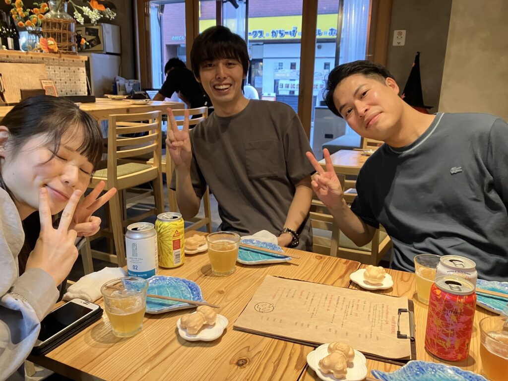 伊藤さん,松本さん,山内さん(R1年度修了)と先生の宴会の一コマ.