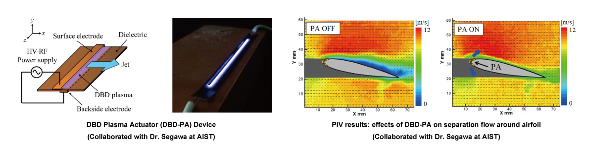 機械的駆動部を持たず電気的に気体の流れを制御することができるDBD(誘電体バリア放電)プラズマアクチュエータは航空機や風力発電の翼周りの境界層・剥離制御などへの応用が考えられています。私たちの研究室では, 現在,DBDプラズマアクチュエータの高性能化を目差した基礎研究を進めています。