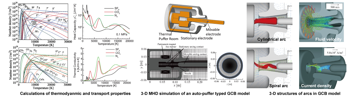 ガス遮断器(Gas Circuit Breakers,GCBs)は,電力系統に生じた短絡や地絡等の事故時の故障電流を遮断し,電力系統を保護するために必要不可欠な電力機器の一つです.発電所や変電所など,私たちの住んでいる周りにもガス遮断器はいたるところに設置されています。電流遮断指令を受けたガス遮断器の内部では,ノズル内の一対の電極が機械的に切り離され,電極間に数万度のアークプラズマが生じます。このアークに消弧ガスを吹き付けることでアークの温度を下げて消弧し,電流を遮断します。従来のガス遮断器は,その極めて高い絶縁性能・消弧性能を背景に六フッ化硫黄ガス(SF6)が消弧ガスとして広く用いられています。しかし,SF6ガスの地球温暖化係数は極めて高いため,代替ガスを利用したSF6ガスフリーのGCBの開発・普及が強く求められています。私たちの研究室では,ガス遮断器内で生じる複雑な電磁プラズマ流体現象※1を詳細に扱うことができる数値シミュレーション技術を構築し,その技術を活用して低環境負荷代替ガス遮断器の開発に資する基礎研究を進めています。