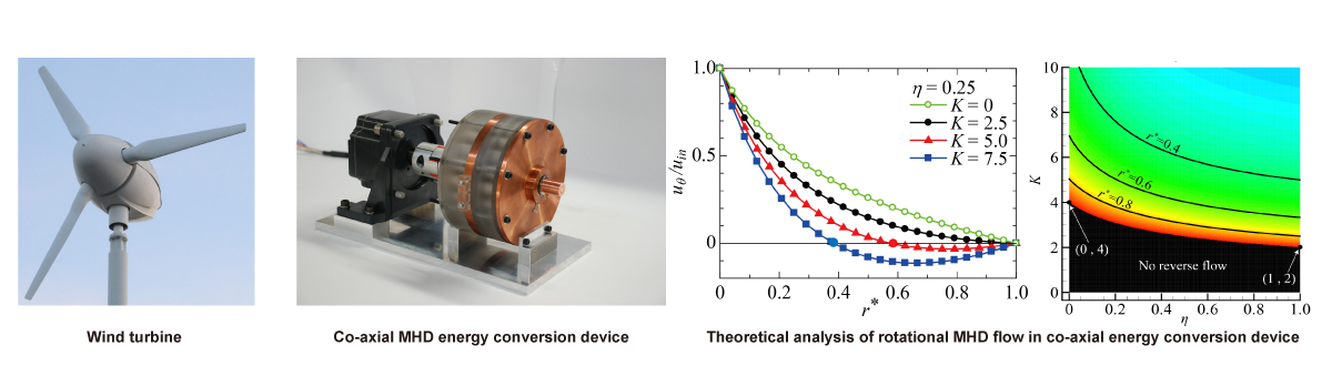 国内外で風力発電の導入が拡大しています。共同研究者であり電磁界応答流体・機能性流体分野でご活躍の東北大学流体科学研究所の高奈秀匡先生は,風力発電の余剰風力エネルギーを高度に利用(エネルギー回生利用)することが可能な液体金属を用いた同軸二重円筒MHD(電磁流体)エネルギー変換器を提案し,モデル実験機を用いてそのアイデアの実証に成功しています。 しかし,装置内の流体場・電磁場を観測することが難しく,装置内の電磁流体現象(MHD乱流現象,渦電流など)の理解が不十分な状況にあります。 私たちの研究室では,東北大の高奈先生やMHD乱流解析で世界的に著名な慶應義塾大学小林先生との共同研究により,同軸二重円筒内MHDエネルギー変換器内の電磁流体現象について理論解析・電磁流体シミュレーションから理解を深め,そこで得られた知見を同変換器の高性能化に繋げることを目指しています。